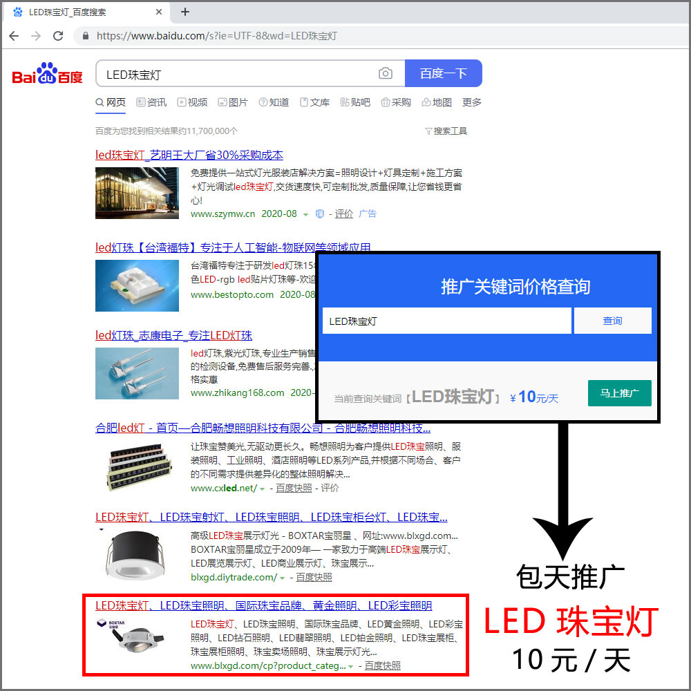 关键词推广成功案例,推广词:LED珠宝灯¥10元天,搜索首页包天推广,网站包年推广