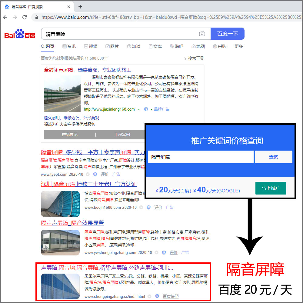 关键词包天推广成功案例,产品词:隔音屏障¥20元包天推广,推广产品词共10个,上首页5个,上词率50%,达标